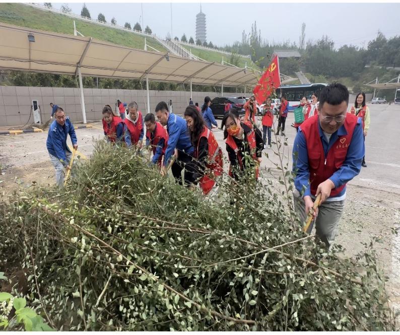 活动现场,党员干部冲锋在前,公交职工与社区工作者混合编组、协同作战。大家手持铁锹、扫帚等工具,对充电桩周边、围墙死角的杂草展开“地毯式”清理。大家俯身钻进设备间隙,细致捡拾塑料袋、烟头等易燃杂物,不放过任何一处安全盲区。“作为党员,守护群众出行安全是我们义不容辞的责任!”参与活动的党员王师傅干劲十足,现场党旗飘扬,劳动热情高涨。
